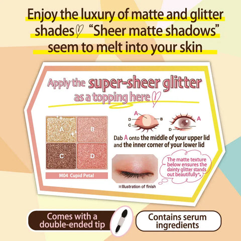 A 4-color eye shadow with 3 colors of matte and 1 color of delicate glitter with a high fit and moist and rich texture.